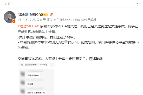 随后,理想汽车第一产品线总裁汤靖在微博上确认了这一消息。他发文称,感谢大家对MEGA的关注,我们已经关注到这起交通事故,同事已经赶往现场协助车主处理。关于事故详细情况,我们正在了解中。