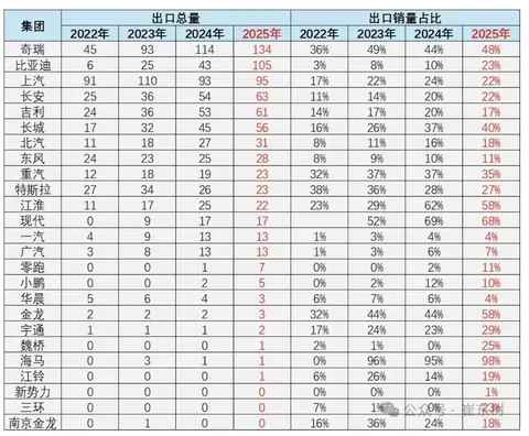 根据乘联分会数据,2025年我国主要汽车集团出口量前十名分别是:奇瑞、比亚迪、上汽、长安、吉利、长城、北汽、东风、重汽、特斯拉。