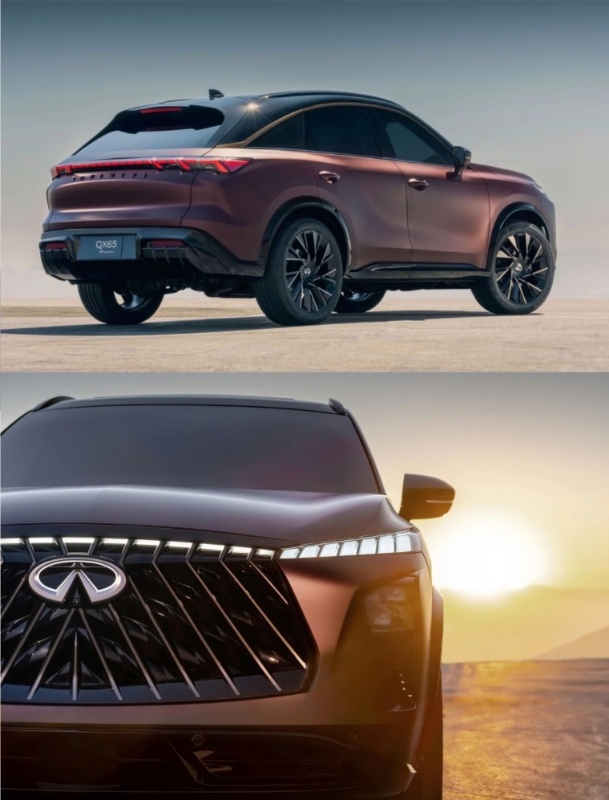 外观上,QX65借鉴了QX60的前脸底子,但换上了专属的分体式大灯,前保险杠也重新设计过,下部进气口看着更有冲击力,格栅的气场也比QX60强了不少。车侧绝对是它的加分项,溜背车顶线条很流畅,A柱往后的造型带着股肌肉感,再配上棱角分明的后挡风和造型特别的尾灯,把当年FX系列的动感劲儿完全找回来了。车顶轮廓的铜色饰条、亮黑车顶再加上特殊车漆,质感也拉满了。