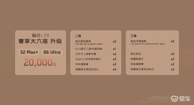 奢享大六座版本(52 Max+ 奢享大六座、66 Ultra 奢享大六座):在对应五座顶配版本基础上选装2万元,聚焦多成员家庭出行需求,升级二排独立奢享座椅、21.5英寸4K二排娱乐屏与二排侧气囊,让每一位乘客都能获得舒适体验,完美适配三代同堂出行,加价幅度合理,无需为冗余配置付费。